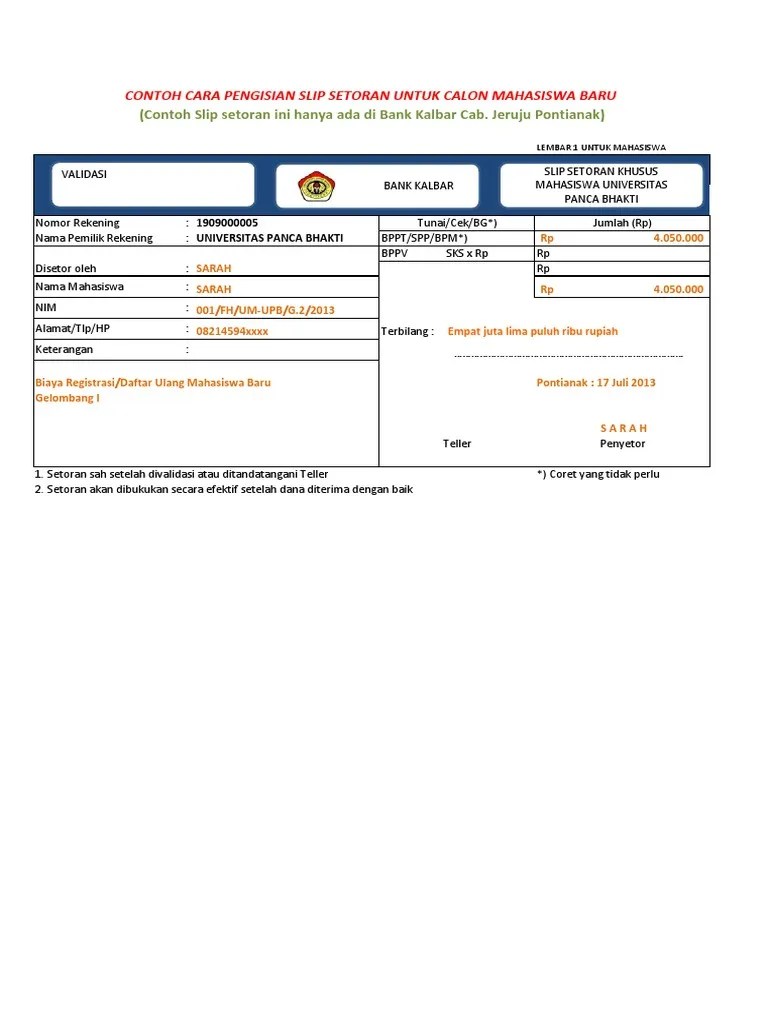 Simpan slip setoran sebagai tanda bukti pembayaran. Mengisi slip setoran dengan tata cara sebagai berikut : Contoh ini juga berlaku untuk metode pembayaran lainnya seperti slip transfer atm, internet banking, wesel pos, dll yakni minimal melampirkan data berikut . Bank rakyat indonesia (persero) tbk. Untuk pemesanan bisa hubungi ke kami bisa kirim contoh kirim file design contoh yg mau dicetak bisa hubungi email :